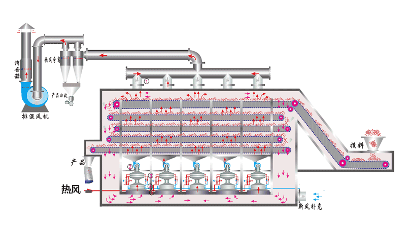 帶式干燥機主要由進風單元、排風單元、循環風單元、網帶、加熱系統、加料器、傳動機構、控制系統等部件組成。物料由撒布機均勻地鋪在網帶上,網帶采用12-60目不銹鋼(或碳鋼)絲網,由傳動裝置拖動在干燥機內移動,干燥段由若干單元組成,熱空氣通過風機穿過物料層,完成熱量與物料的交換過程,含水量較大的氣體由排風機排出。